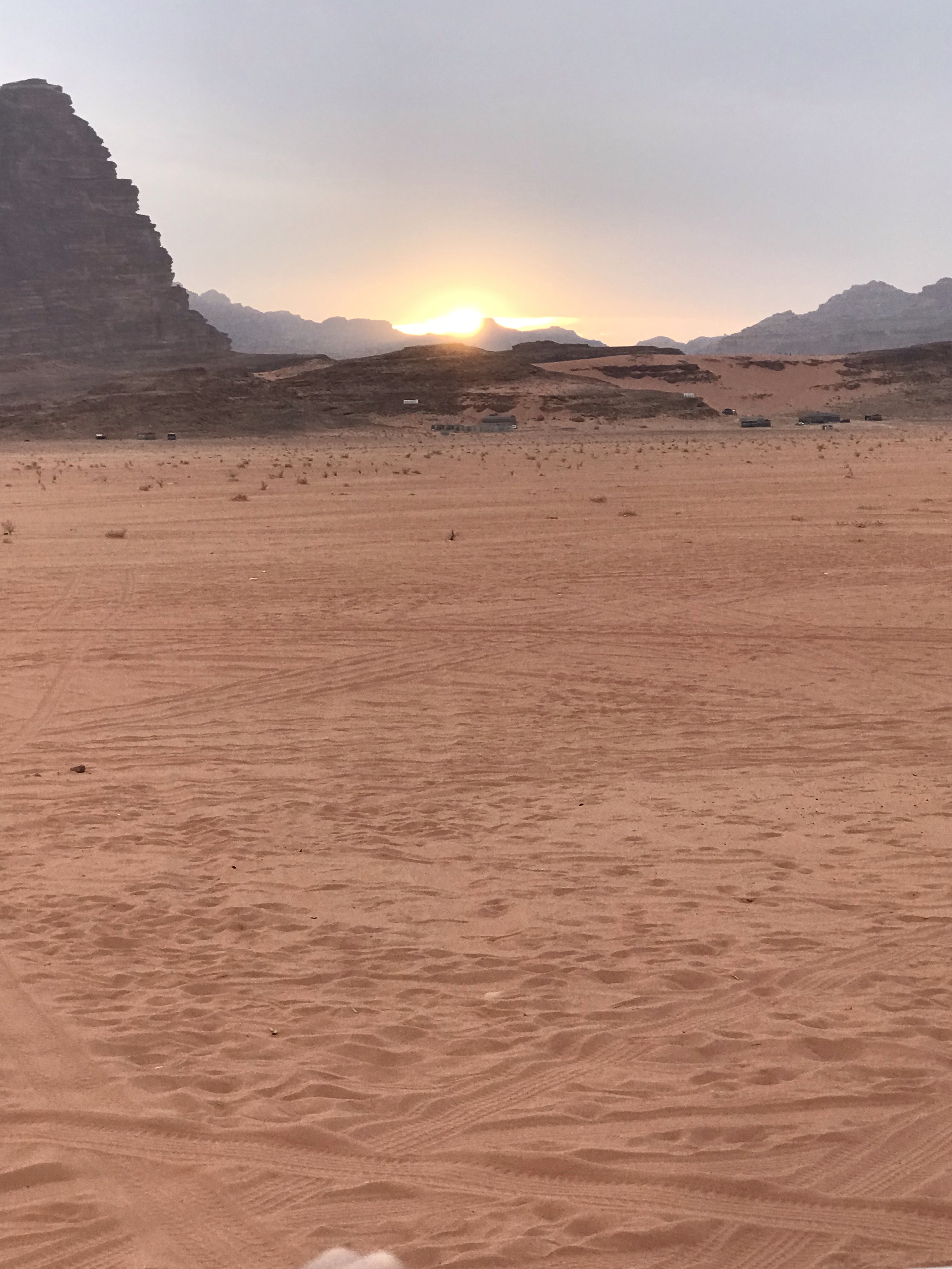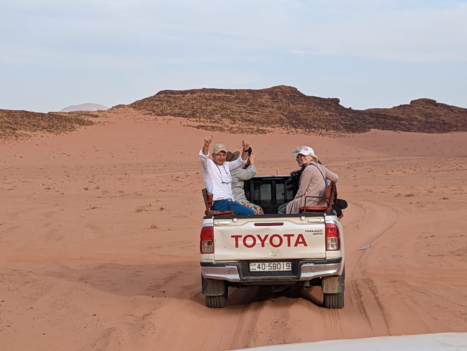We left the Bedouin camp in our little pickup trucks, and the drive was as serene as an open-air pickup truck caravan can be. We enjoyed the ever changing and ever new landscape as the last rays of the sun were filtering over the horizon.